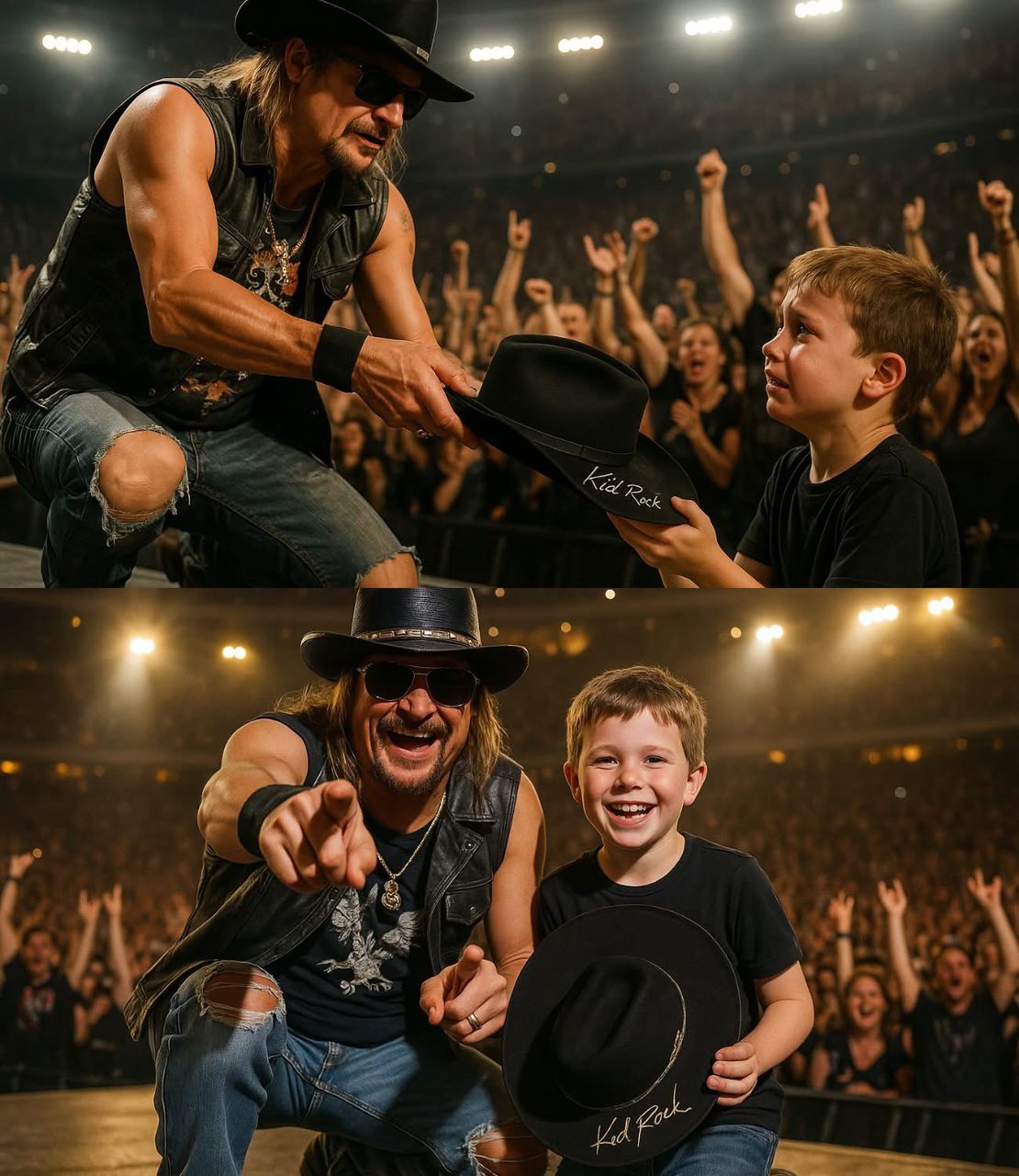 What happened next stunned everyone: Kid Rock approached a young boy who had made his way to the front, eyes wide with awe. The boy, no older than ten, was clutching a small American flag and wearing a big grin that shone brighter than the stage lights. Without hesitation, Kid Rock reached into his own hat — a signature cowboy hat he’s often seen sporting — and handed it directly to the boy.