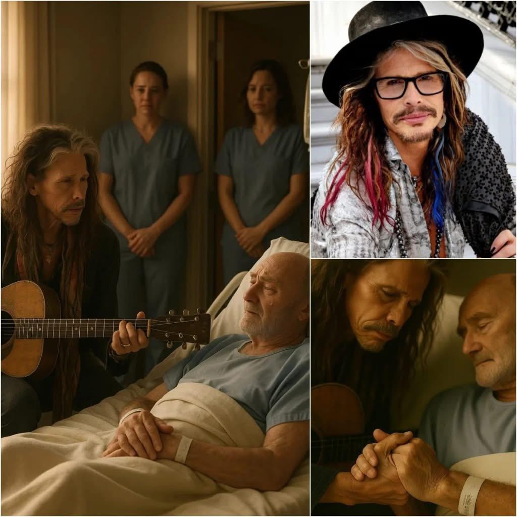 The room was filled with a heavy sense of anticipation and tenderness. Phil Collins, the iconic singer, drummer, and songwriter, lay weakened by months of relentless health battles—spinal complications compounded by heart issues that had taken a toll on his body and spirit. His eyes fluttered open slowly as Steven approached, a gentle smile playing on his face. The two friends had shared stages, stories, and struggles over the years, and now, in this quiet moment, Steven was there to remind Phil of the music and friendship that had sustained them through thick and thin.