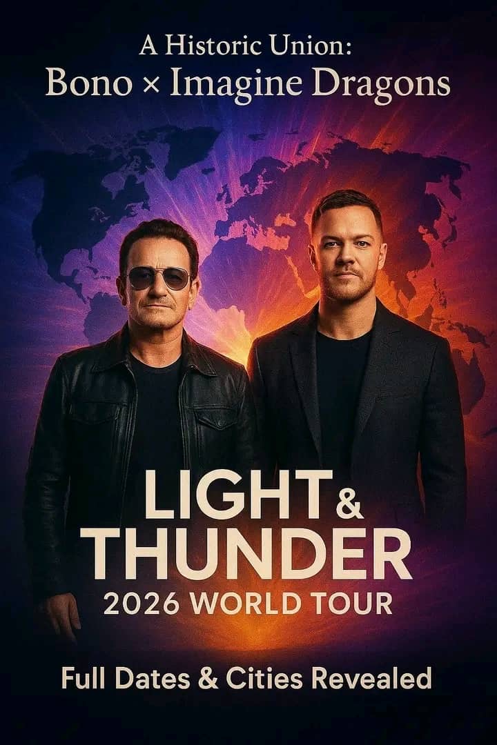 In an unprecedented collaboration that has fans buzzing worldwide, legendary Irish rock icon Bono and chart-topping American band Imagine Dragons are teaming up for a groundbreaking 2026 world tour. Dubbed “A Historic Union,” this once-in-a-lifetime musical journey promises electrifying performances, unforgettable moments, and a blend of iconic sounds that will resonate across generations. With the full list of dates and cities now unveiled, fans around the globe are eagerly planning their journeys to witness this monumental event.