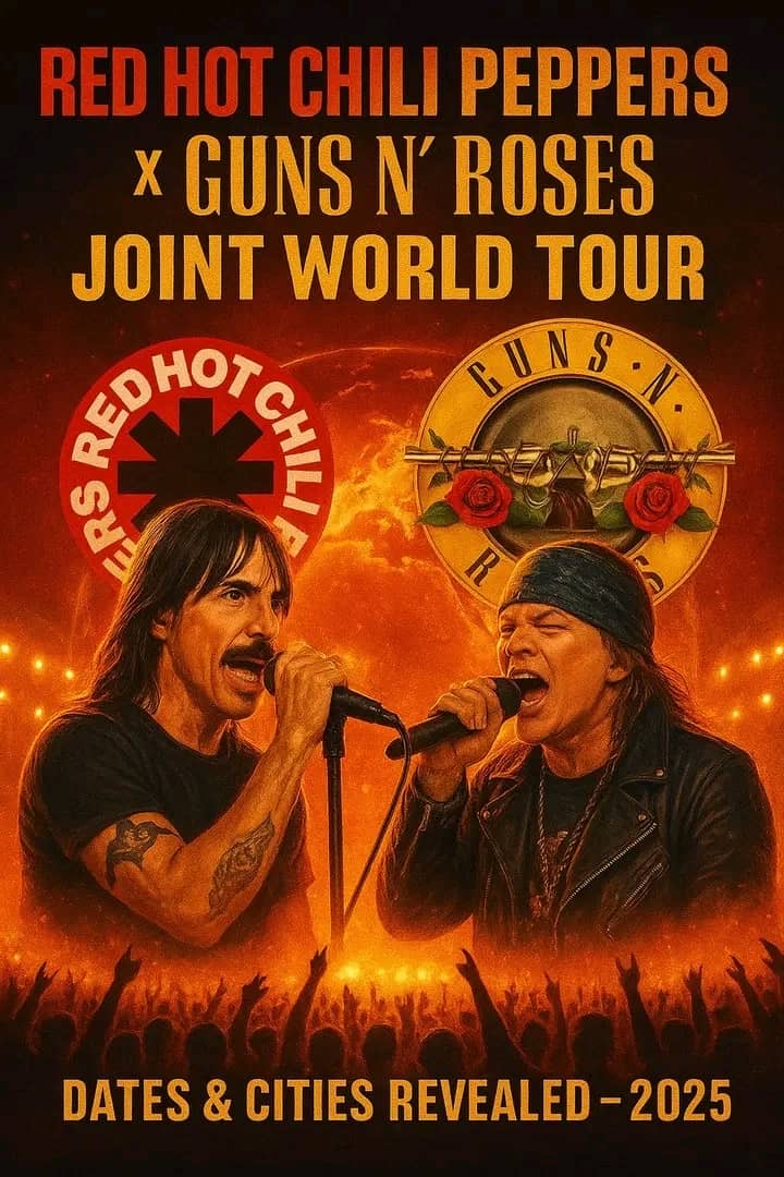 In a seismic announcement that has sent shockwaves through the global music community, two of rock’s most iconic and rebellious forces—Red Hot Chili Peppers and Guns N’ Roses—are teaming up for what is being billed as their **final** joint tour in 2025. Dubbed the **“Legendary Farewell Tour,”** this historic run will span major cities worldwide, offering fans a once-in-a-lifetime opportunity to witness decades of decadence, iconic hits, and explosive performances as these legendary acts take their final bow together.