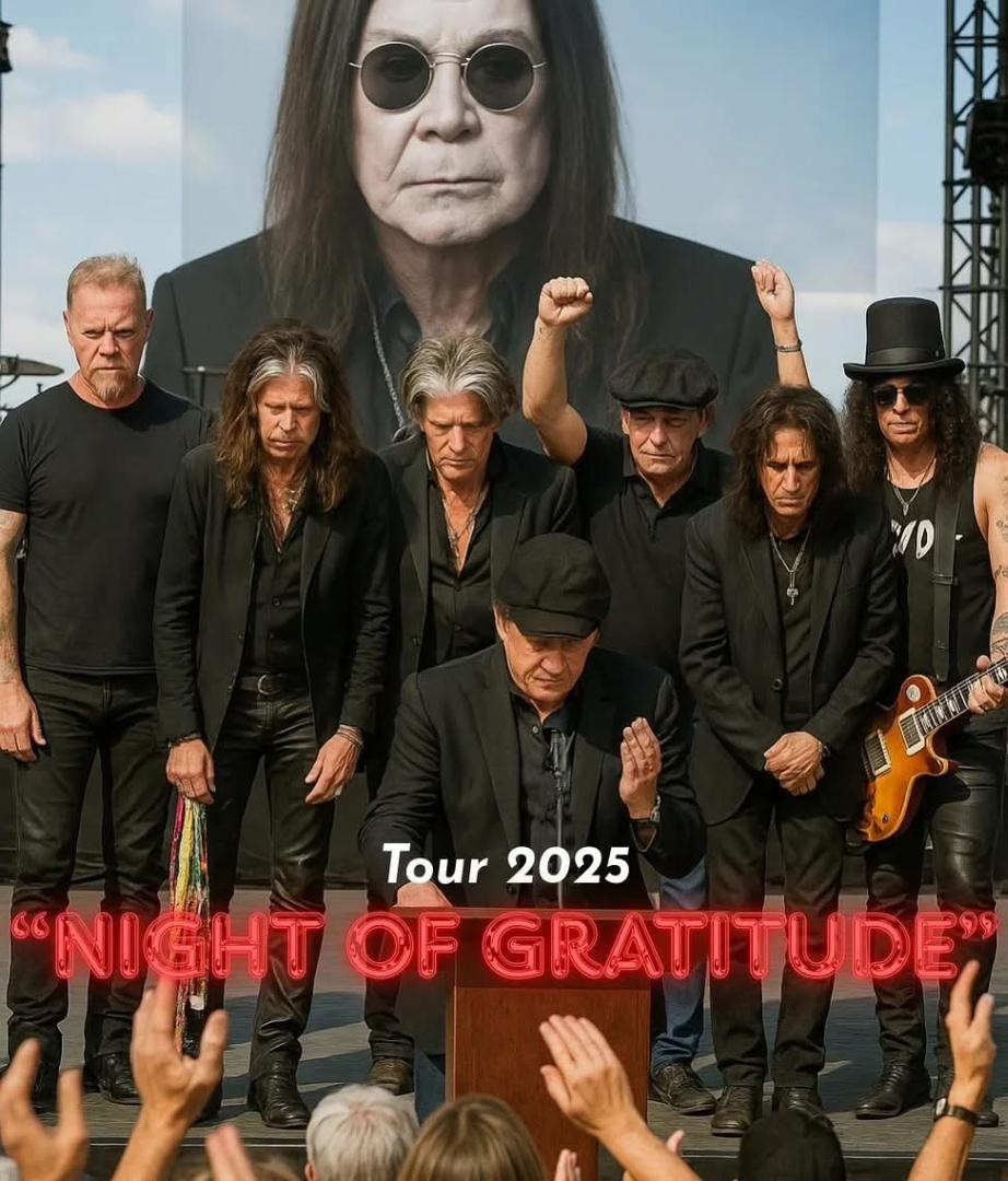 THE WORLD ANSWERS OZZY’S CALL: NIGHT OF GRATITUDE 2025 The rock world is bracing for a moment it never thought it would see again. After more than a decade away, Aerosmith is returning with brand-new music — but this time, it’s more than just a comeback. The “Night of Gratitude” Tour 2025 has been revealed, a global journey dedicated to honoring the memory of Ozzy Osbourne, the eternal Prince of Darkness.