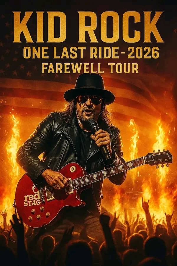 The “One Last Ride” tour will feature electrifying performances of iconic hits such as “Bawitdaba,” “Cowboy,” “American Bad Ass,” and “All Summer Long,” alongside some surprises and unreleased material. Fans can expect a high-energy show filled with pyrotechnics, rebellious visual effects, and a stage setup that embodies Kid Rock’s gritty, no-holds-barred attitude. This final tour aims to capture the raw power and authenticity that has defined his career — an unapologetic statement of individualism and defiance.