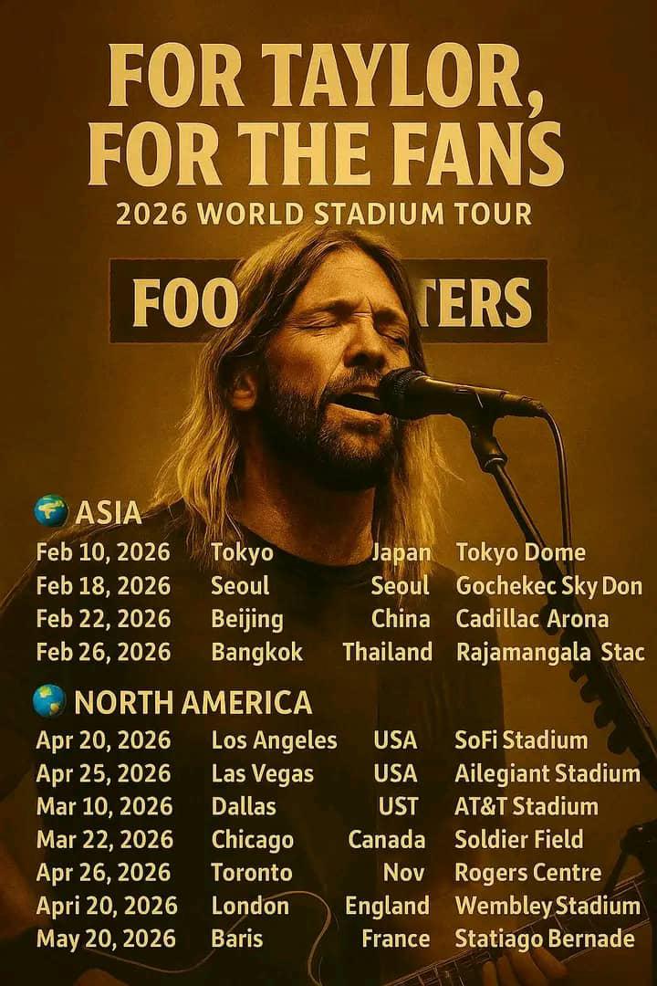 For Taylor, For the Fans: Foo Fighters Embark on 2026 World Stadium Tour Across Asia, North America, and Europe — A Tribute to Friendship, Faith, and the Fire of Rock
