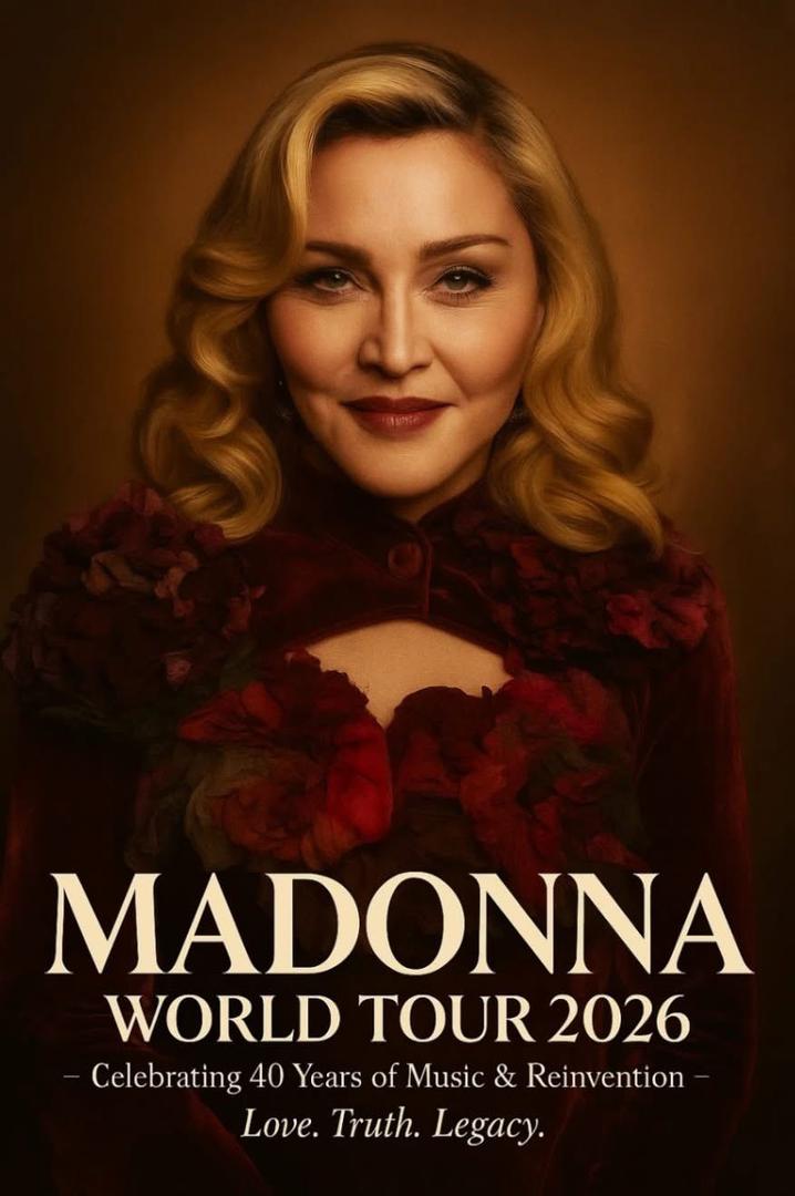 In a momentous announcement that has sent shockwaves through the music industry and sent fans into a frenzy, Madonna, the undisputed Queen of Pop, has officially revealed her plans for the 2026 World Tour. Spanning over four decades of groundbreaking music, fearless reinvention, and cultural influence, this tour is set to be a remarkable journey through her illustrious career. More than just a series of concerts, it promises to be an emotional celebration of love, struggle, resilience, and transformation — a tribute to her enduring legacy and her unwavering ability to push artistic boundaries.