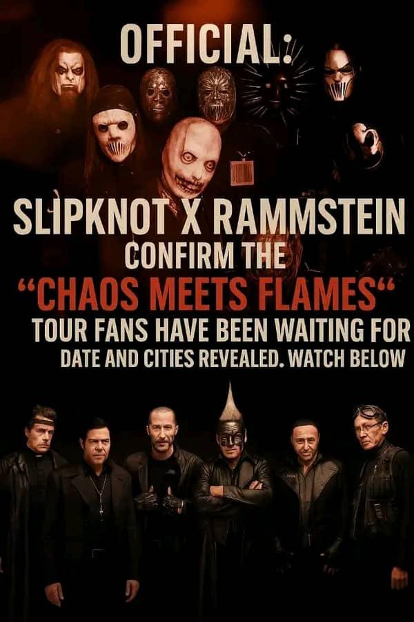In a move that has sent shockwaves through the global metal community, Slipknot and Rammstein have officially announced their joint 2026 super-tour, appropriately titled “CHAOS MEETS FLAMES.” For decades, fans imagined what might happen if the masked chaos of Iowa collided with the industrial firestorm of Berlin — but few ever expected it to become reality. Today, that fantasy is finally official.