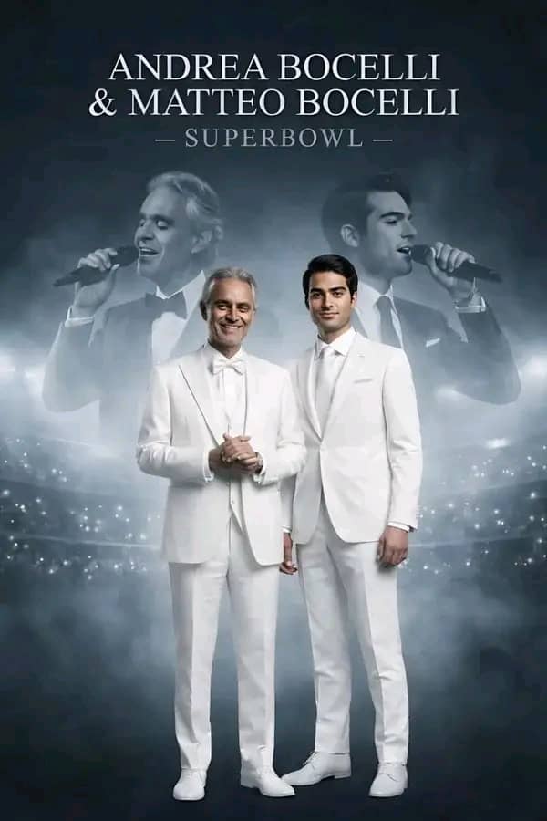 Super Bowl 2026, scheduled to take place in the vibrant city of Los Angeles, is already stirring anticipation across the world. While the game itself is a spectacle of athleticism and entertainment, the halftime show often stands out as a defining cultural moment—an opportunity for artists to create history. This year, the organizers have outdone themselves by orchestrating a performance that is both deeply personal and universally inspiring: Andrea Bocelli, the legendary tenor whose voice has touched hearts worldwide, will be joined by his son Matteo, a rising star in his own right, creating a breathtaking duet bound by blood and music.
