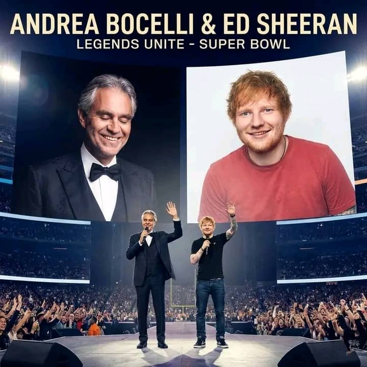 In a move that promises to be one of the most historic and unforgettable moments in Super Bowl history, two of the world’s most revered musical legends are set to share the stage at Super Bowl 2026. Andrea Bocelli, the legendary Italian tenor whose voice has touched millions worldwide, and Ed Sheeran, the modern pop phenomenon whose songwriting and soulful sound have captivated new generations, are preparing to deliver a performance that transcends genres, generations, and borders. This isn’t just a musical act; it’s a once-in-a-generation meeting of timeless artistry and modern storytelling that will redefine the Super Bowl stage forever.